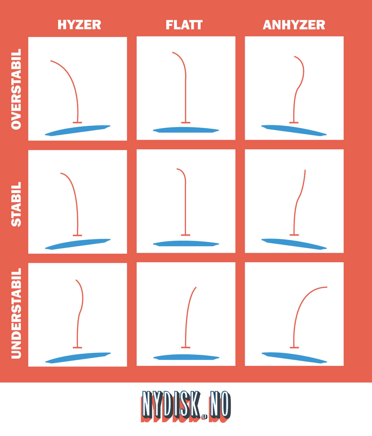 For å gjøre det enkelt for deg har vi laget en plakat som viser flyveegenskaper til overstabile, stabile og understabile disker når de kastes med hyzer, flat, og anhyzer vinkel. Det betyr at om du er på utkikk etter en disk som kan kastes på en spesiell linje, så kan du se på plakaten og velge deretter.