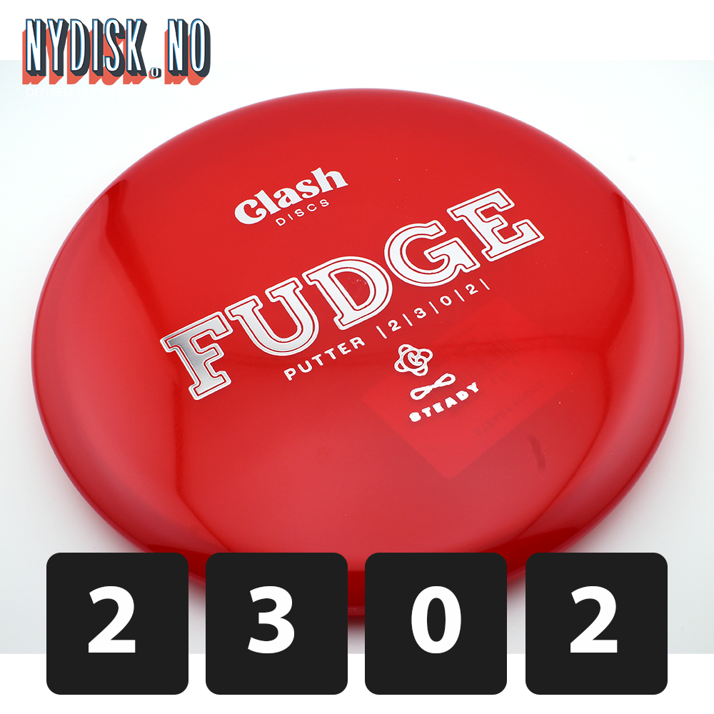 Clash Discs STEADY Fudge er en lavhastighets putt & approach fra Clash Discs, like godt egnet til innspill som den er til putting. Disken har bead og tilbyr en stabil flight med en distinkt fadende avslutning som innspillsdisk og som putter har den en liten hook som kommer hendig med for spillere som putter på anyhzer vinkel. Disken trives best ved lave hastigheter og har lite glide, men vår erfaring er at disken tåler mer hastighet enn tallene tilsier.