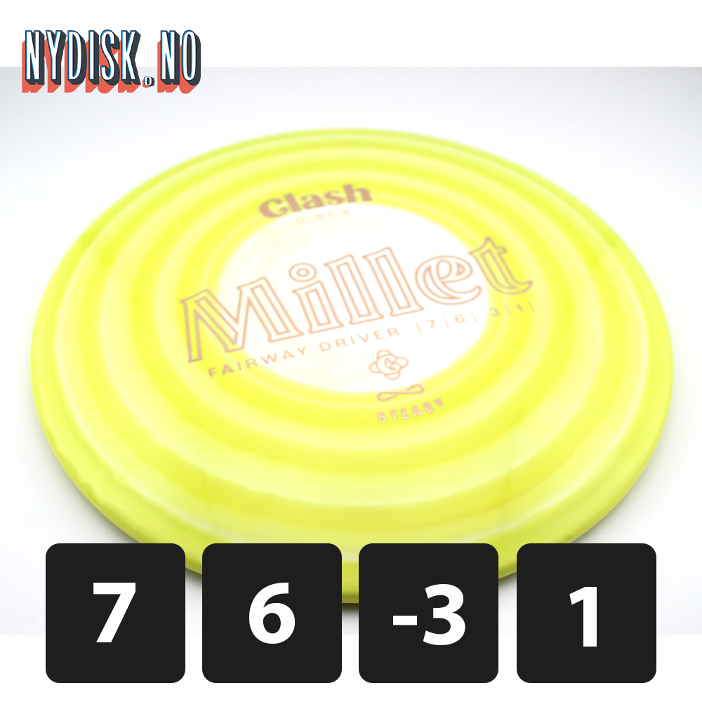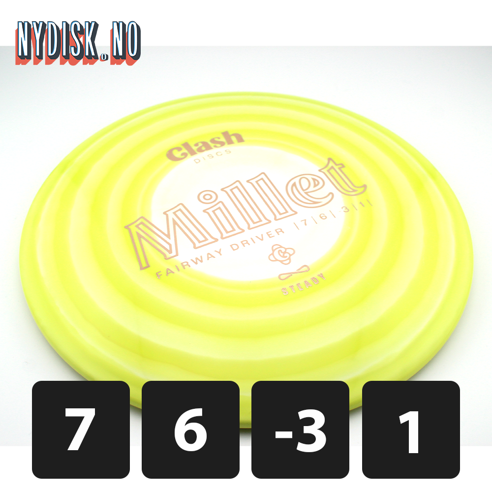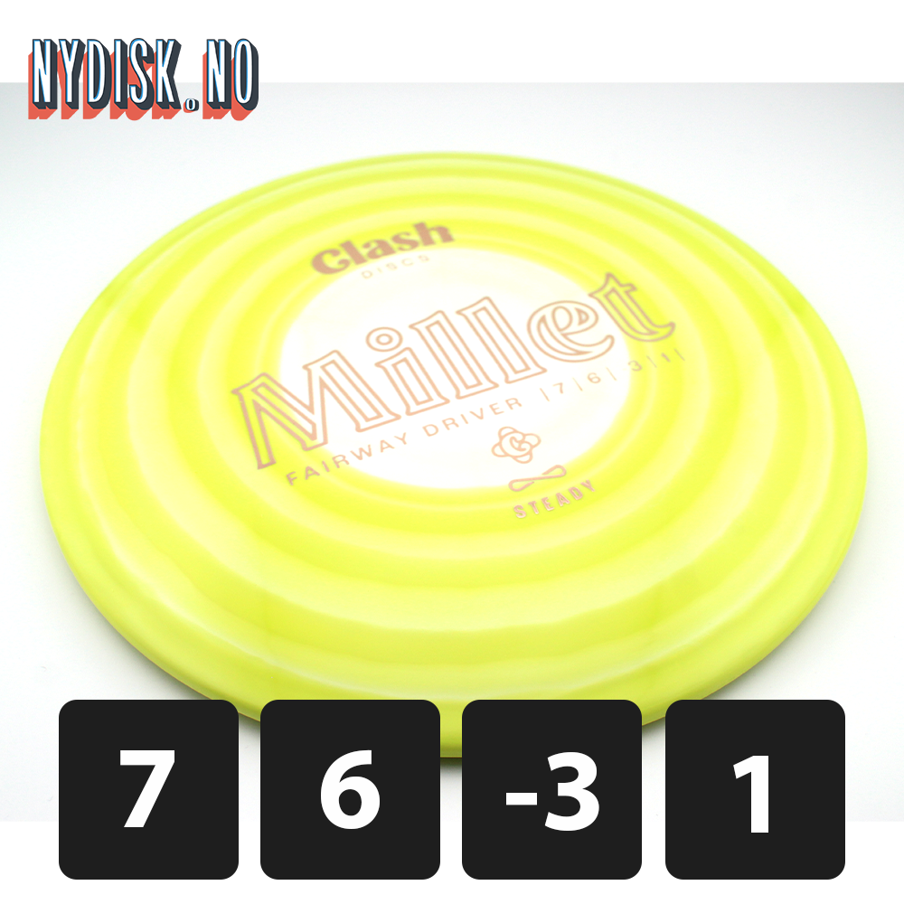 Clash Discs Steady Ring Millet er en svært understabil fairway driver laget for nybegynnere, rollere og standstill hyzer flips. Om du bruker den til det siste gir den deg et helt uvurderlig våpen i skogen. Disken flipper alltid opp og har du gitt den rett kombo av vinkel og hastighet vil den drifte mot høyre og lande rett ned - ypperlig når en fade sender deg ut av fairway eller sirkel 1.