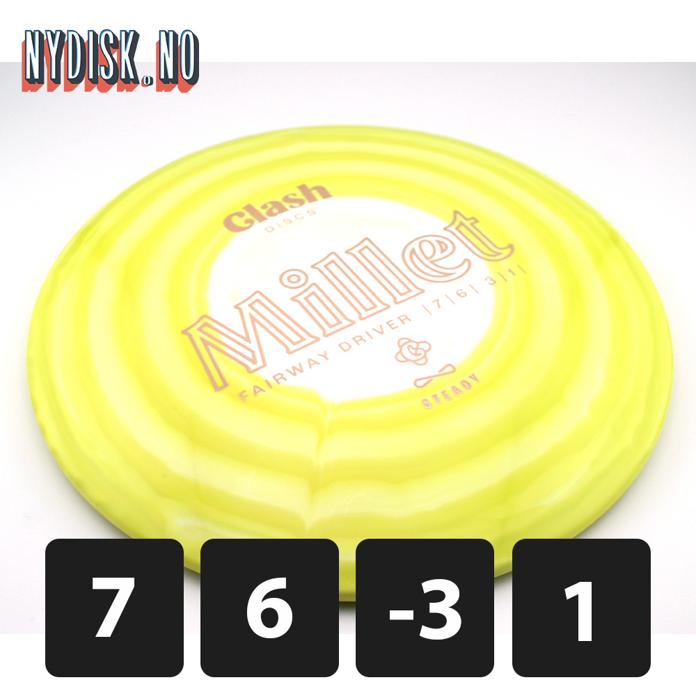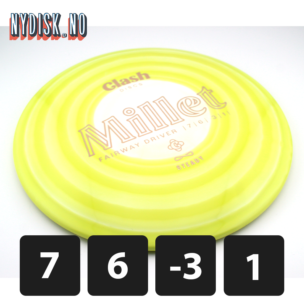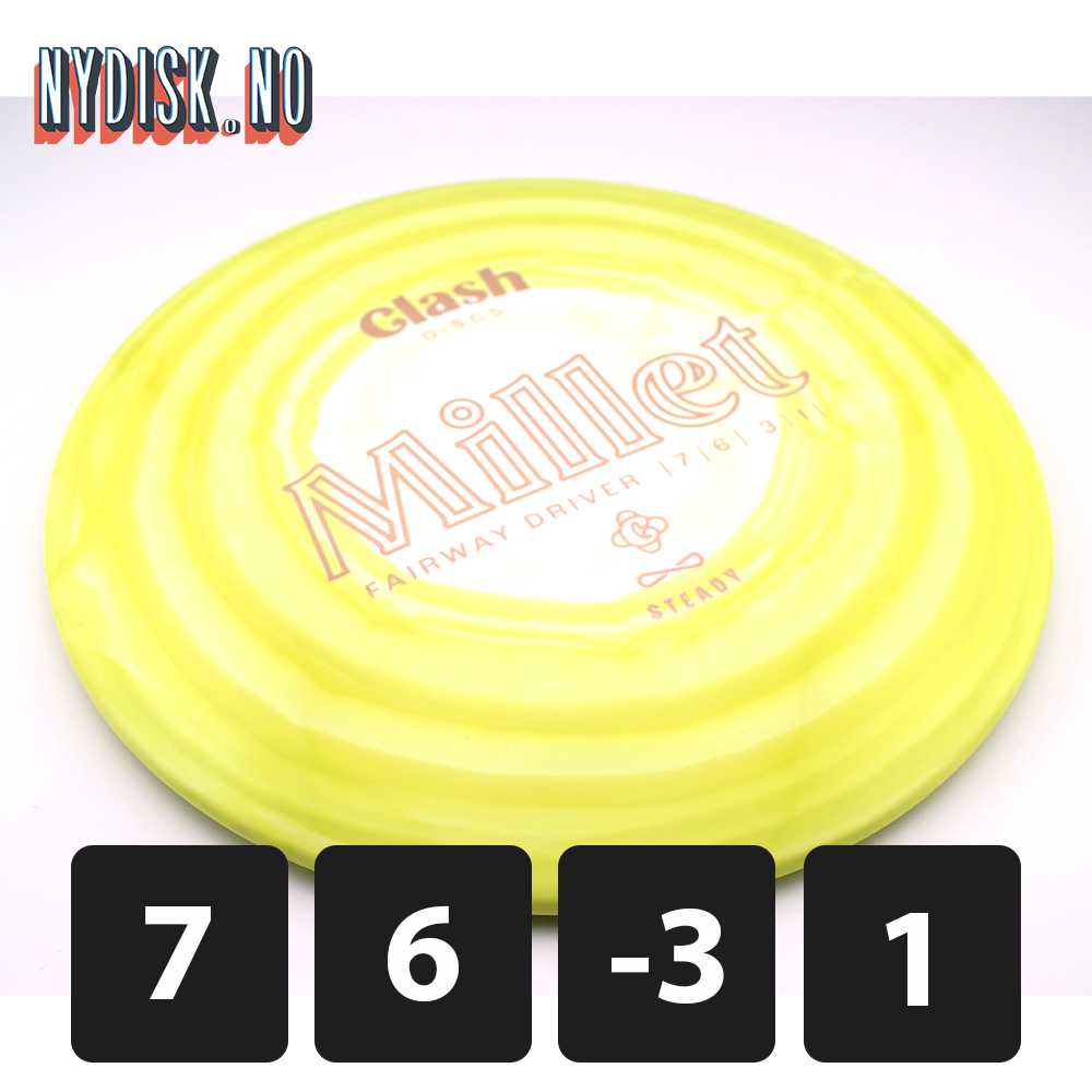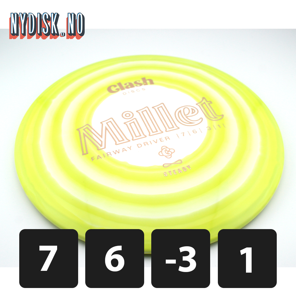 Clash Discs Steady Ring Millet er en svært understabil fairway driver laget for nybegynnere, rollere og standstill hyzer flips. Om du bruker den til det siste gir den deg et helt uvurderlig våpen i skogen. Disken flipper alltid opp og har du gitt den rett kombo av vinkel og hastighet vil den drifte mot høyre og lande rett ned - ypperlig når en fade sender deg ut av fairway eller sirkel 1.