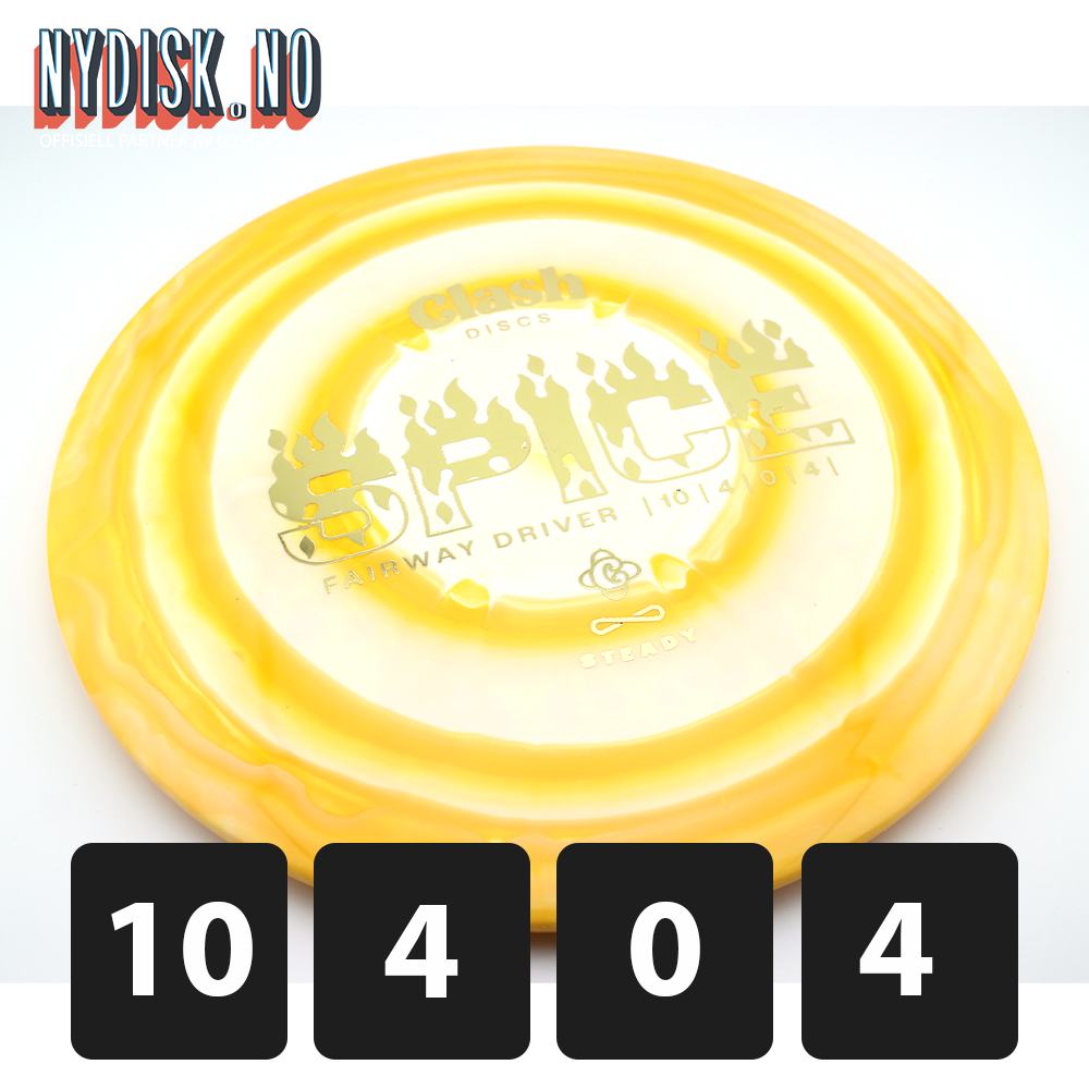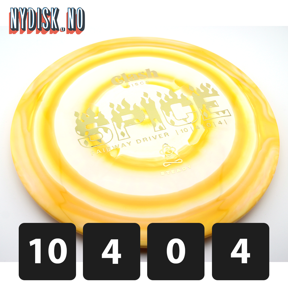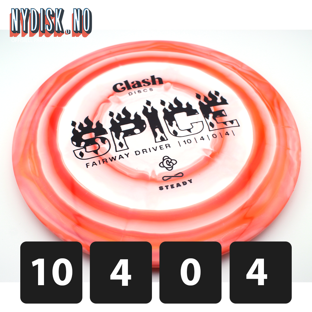 Clash Discs STEADY RING Spice er en overstabil fairway driver i samme kategori som Innova Firebird og Discraft Captains Raptor. Den er svært pålitelig på vindfulle dager, har lite glad og en kraft fade. Grepet i plasten og den overstabile flighten gjør den svært godt egnet til store hyzer kast og ikke minst som din go-to forehanddisk.