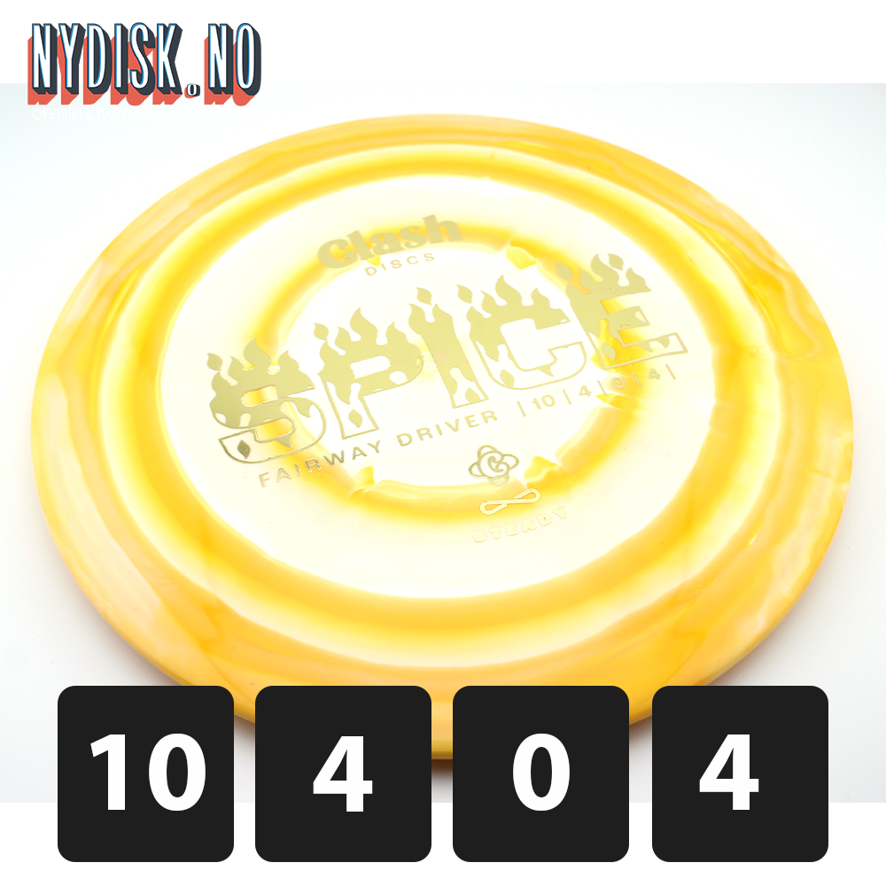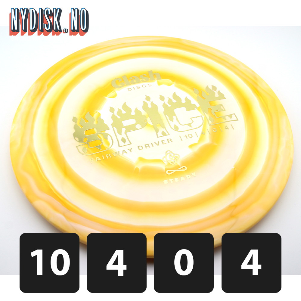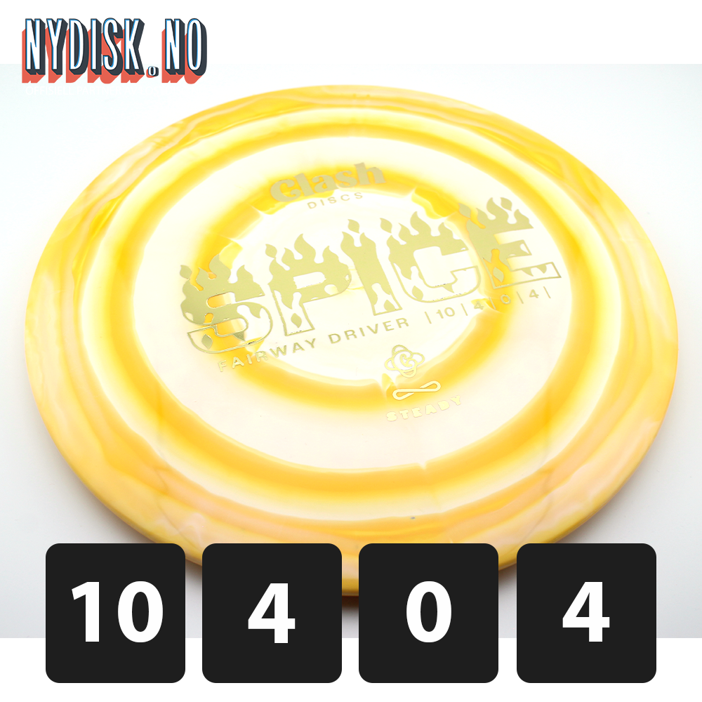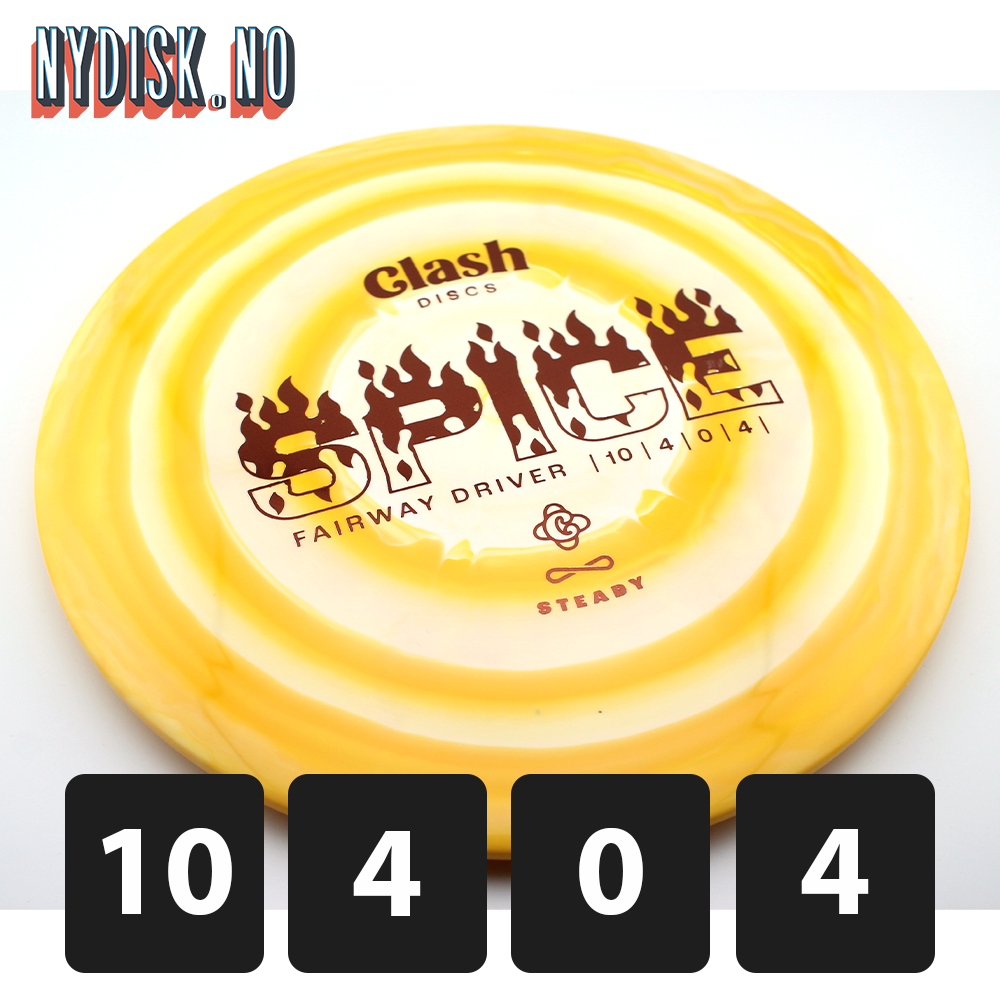 Clash Discs STEADY RING Spice er en overstabil fairway driver i samme kategori som Innova Firebird og Discraft Captains Raptor. Den er svært pålitelig på vindfulle dager, har lite glad og en kraft fade. Grepet i plasten og den overstabile flighten gjør den svært godt egnet til store hyzer kast og ikke minst som din go-to forehanddisk.