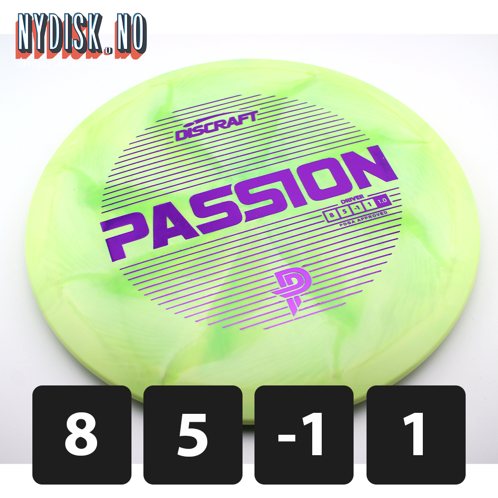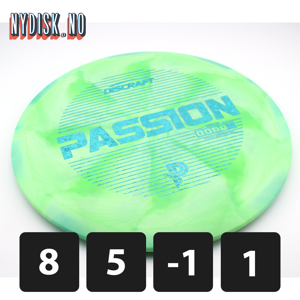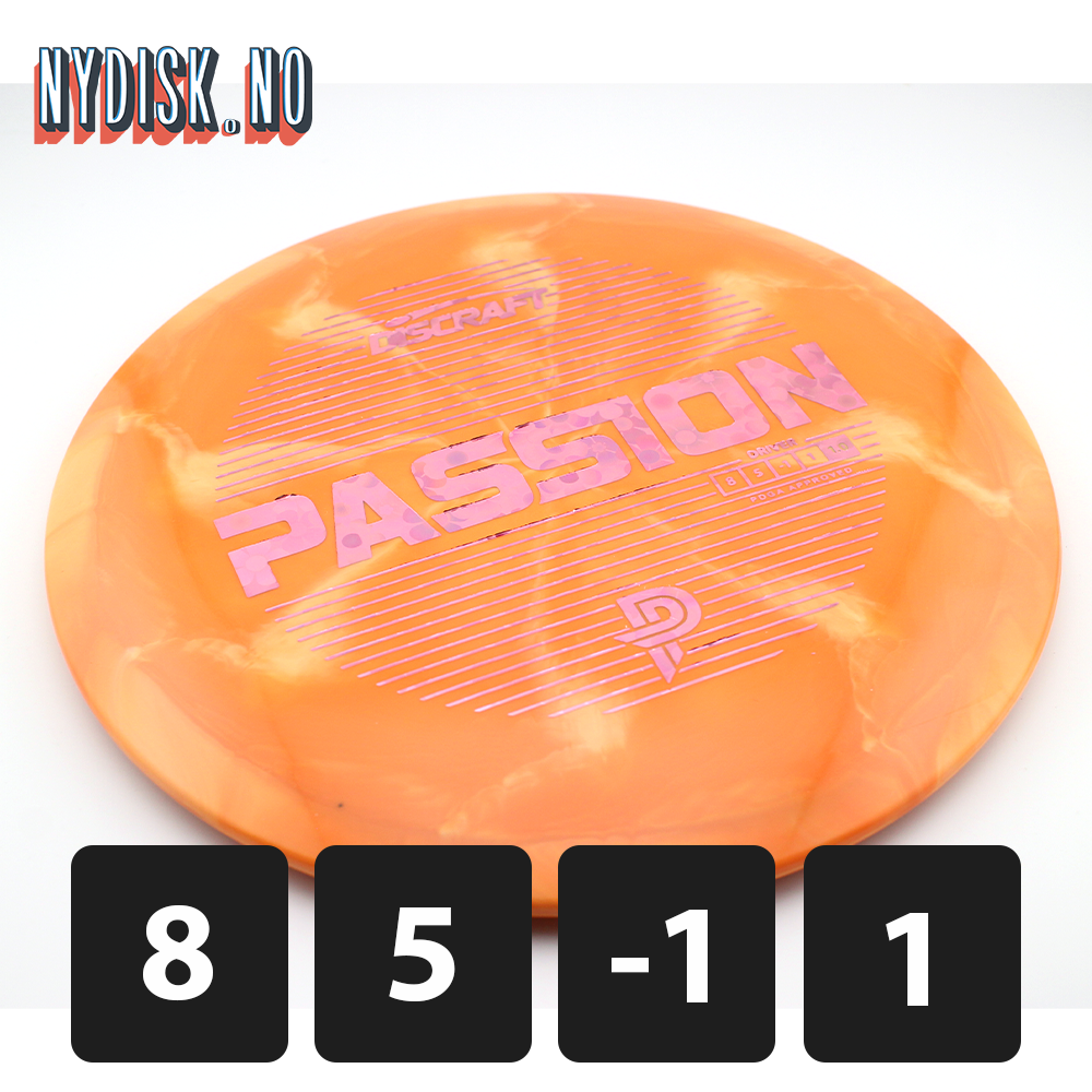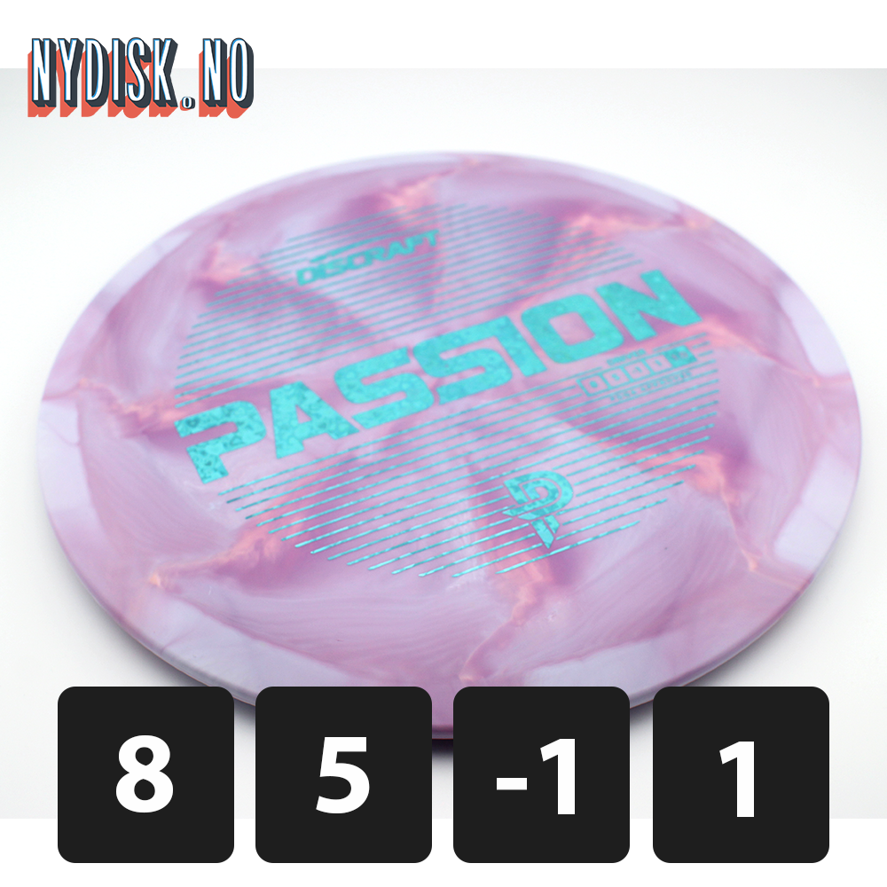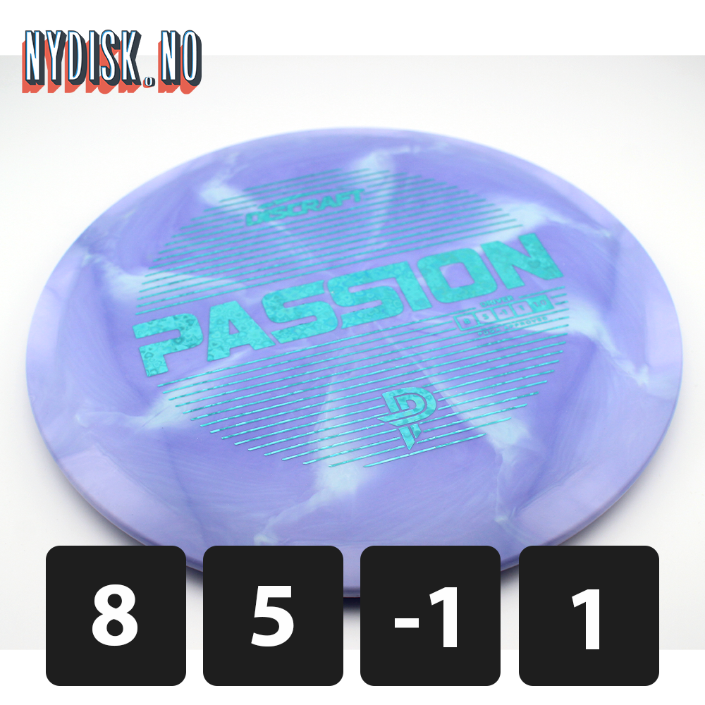 Discraft ESP Passion har raskt blitt en av de mest populære diskene i Norge. Den tilbyr spillere med lavere kastehastighet en helt rett fairway driver som avslutter ferden med en liten fade - den perfekte flighten for trange presisjonskast i skog.