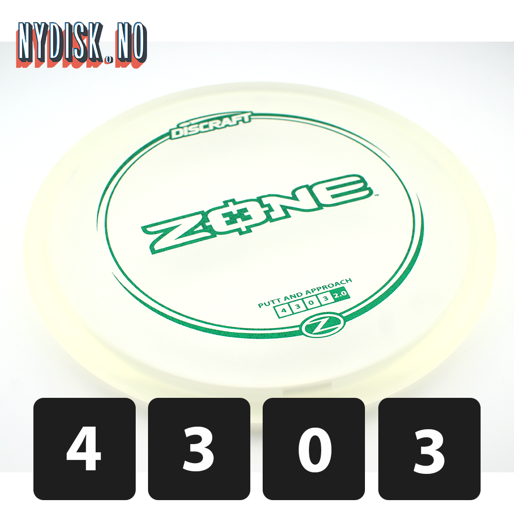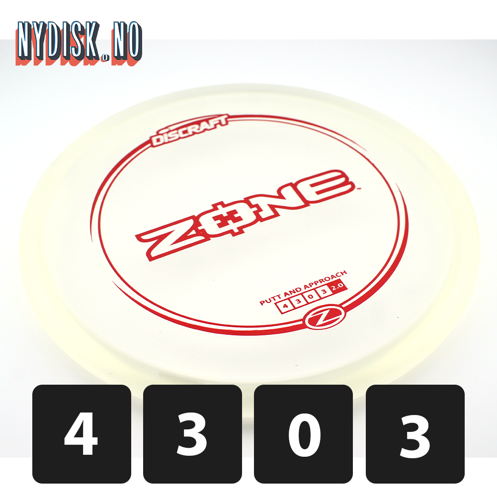 Discraft Zone er en av Discrafts mest solgte disker gjennom tidene. Disken tilbyr en kontrollert fade du kan stole på i være og vind. Disken er perfekt for deg som ønsker stålkontroll på dine innspill og for deg som ønsker en approach disk du kan manipulere på forskjellige vinkler. Zone er også en favoritt for veldig mange på forehandkast da den tilbyr både glide og fade samtidig som toppen av disken ofte er helt flat.