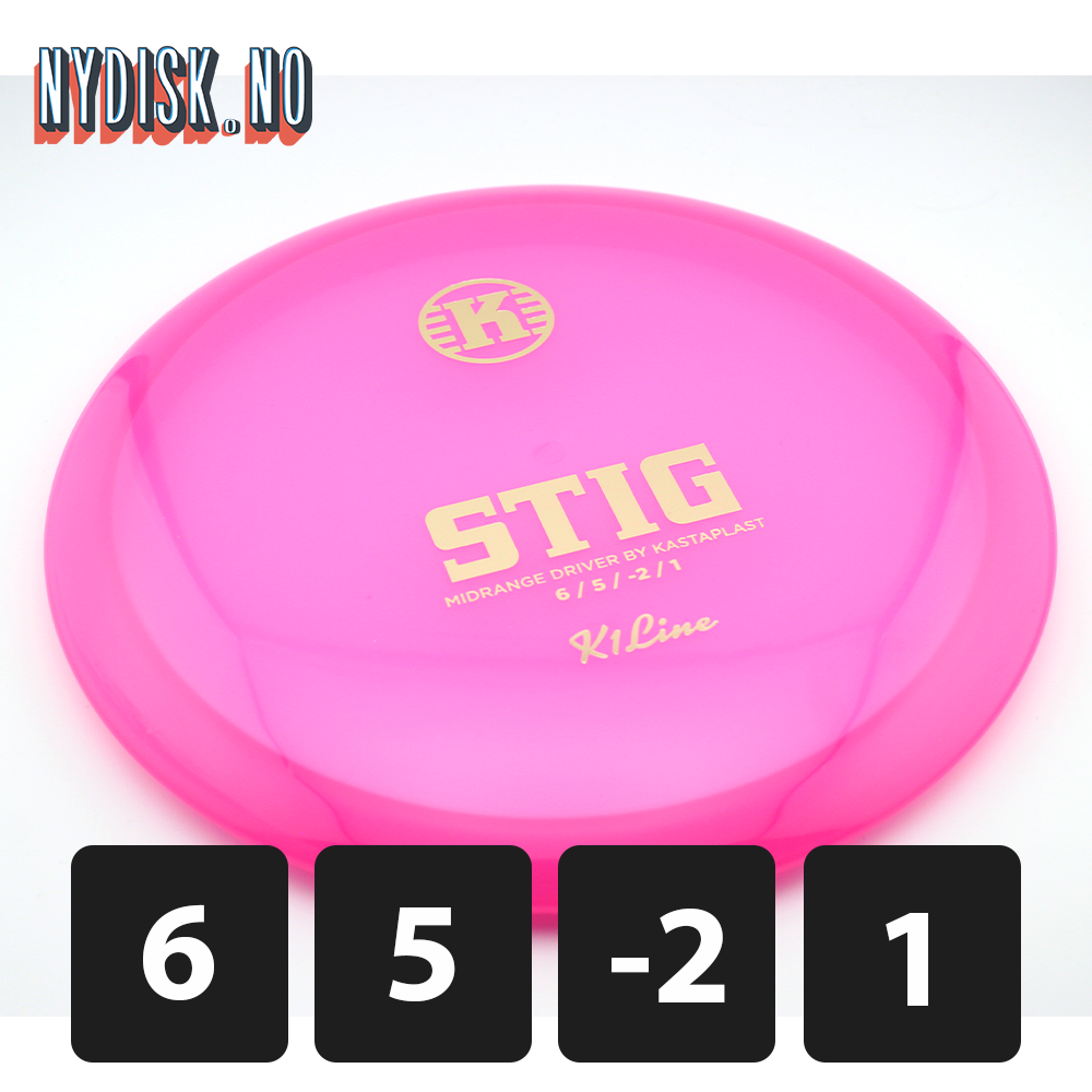 Kastaplast Stig er en rettflyvende disk i overgangen mellom midrange og fairway driver. Den har understabile egenskaper som krever mye touch og er på sitt aller beste når du kaster kontrollert. Disken er svært brukervennlig og kan brukes til rolige rette kast, anhyzer linjer og som en go-to hyzer flip disk.