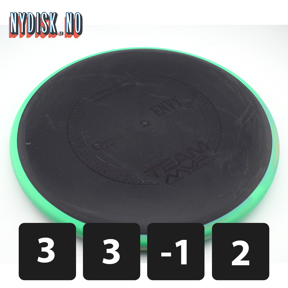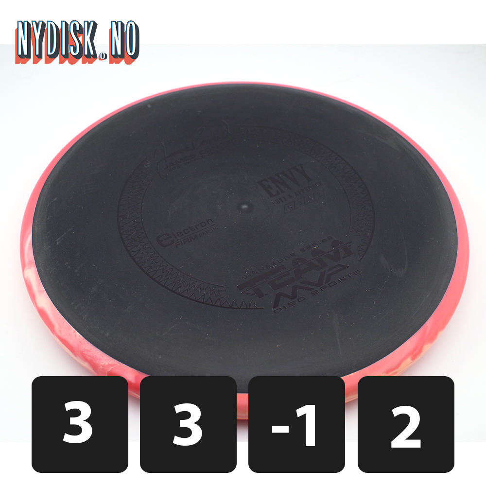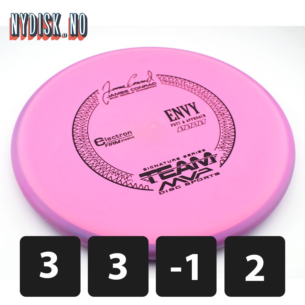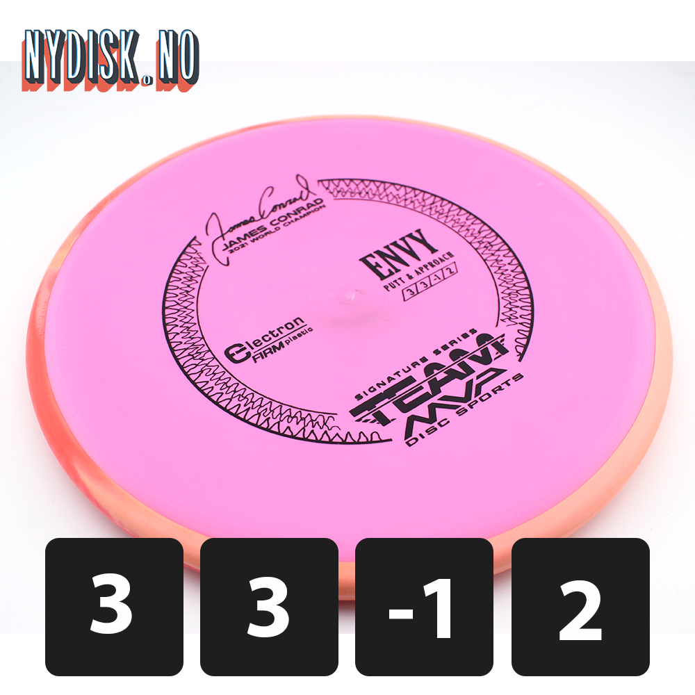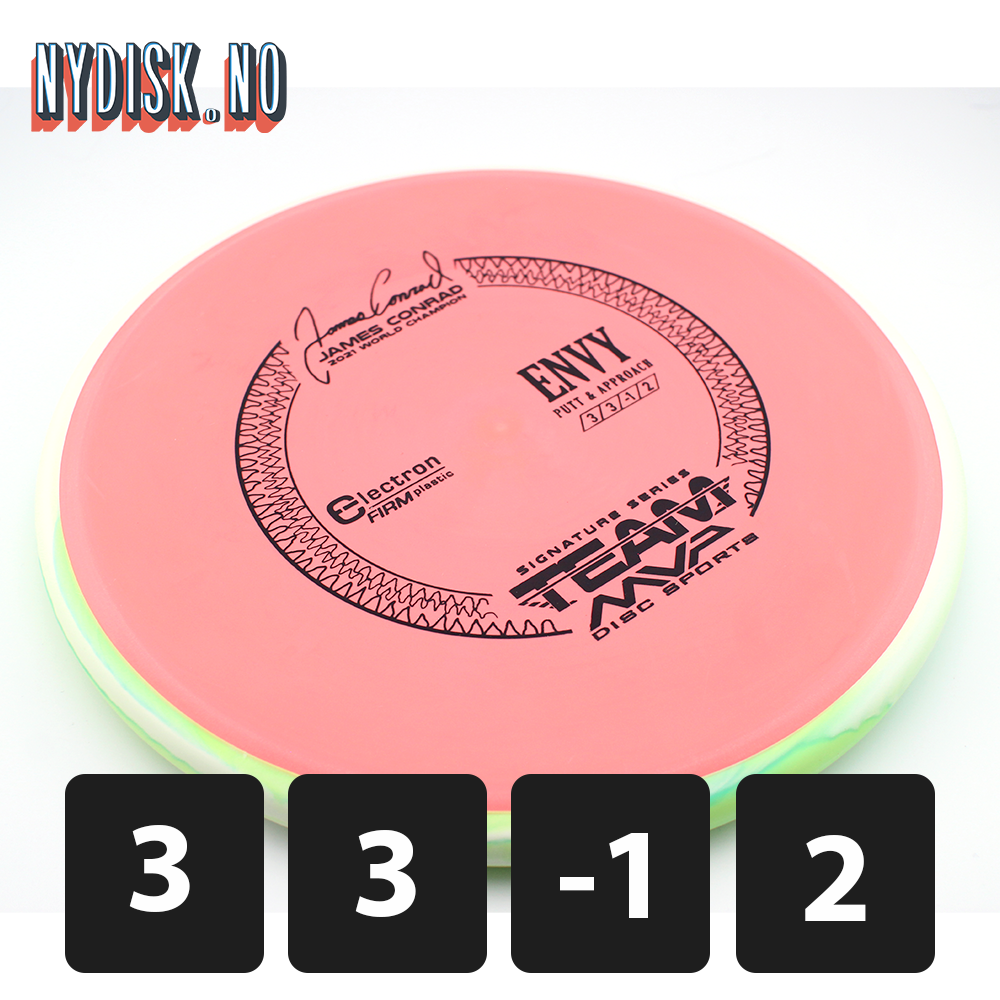 Envy er kjent som putteren James Conrad kastet på hull 18 under VM i 2021 da han utførte det som i dag kalles “The Holy Shot”. Disken anerkjennes som en av de beste kasteputterne som noensinne er produsert, men fungerer også som en vanlig putter. Ut av hylle tilbyr Envy en fade mot slutten av flighten og er kjent for å beholde egenskapene sine selv ved høye hastigheter.